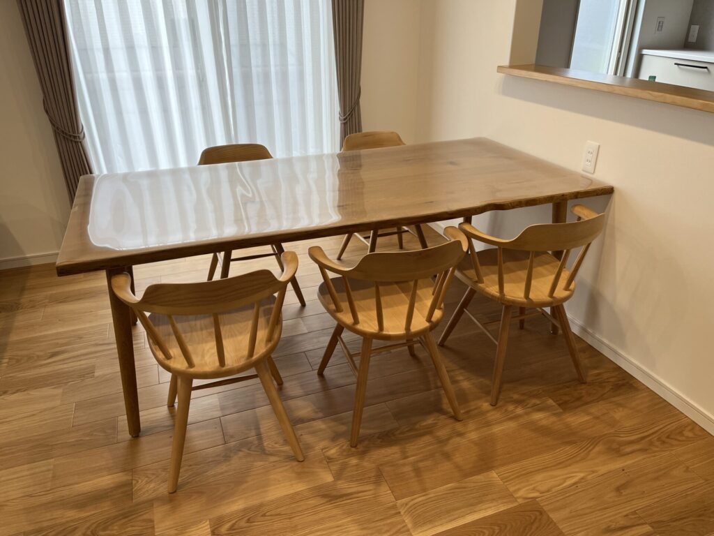 ダイニングテーブルは当店でも人気のライブエッジ天板(一枚板風)で、木材の表皮に近い部分を天板に接ぎ合わせ、木の自然のカタチを活かして仕上げています。
