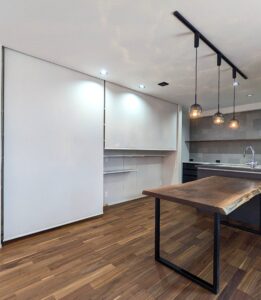 ダイニングスペースには収納部分を隠せるようにロールスクリーンを設置。