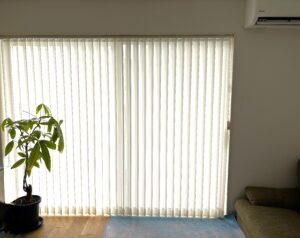 今回ご紹介するのは、リビングの掃き出し窓にバーチカルブラインド、腰高窓にロールスクリーンを施工させていただいた