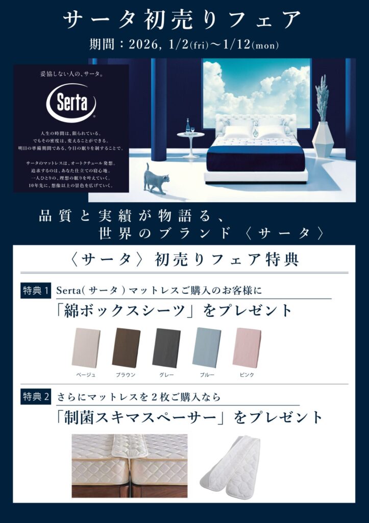 EVENT&NEWS キャンペーンやイベントなどお得な情報を発信中! 2025.12.26 プレゼント サータ初売りフェア ※アウトレット品は対象外となります。 サータプレゼント サータ初売りフェア 2025 12/26 プレゼント プレゼント 新しい記事 2026 新春初売り 過去の記事 年末年始の営業ご案内 一覧に戻る