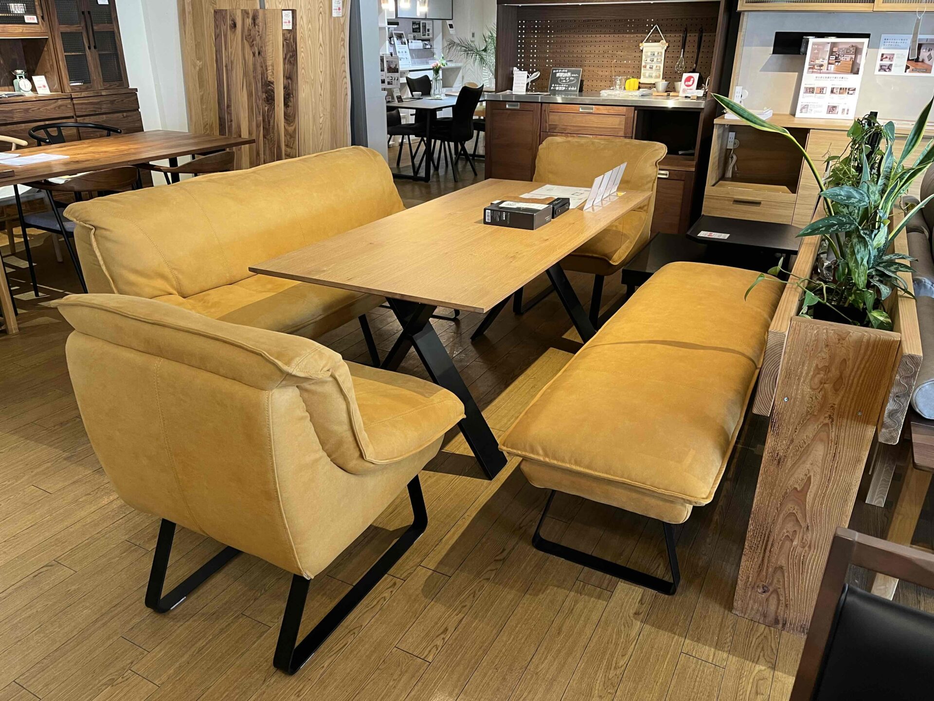 レザーテックスのリビングダイニングセットもあります。モダンで洗練されたデザインが特徴で、ソファやベンチはデザイン性に加え、ふっくらとした座り心地の良さもあります。
